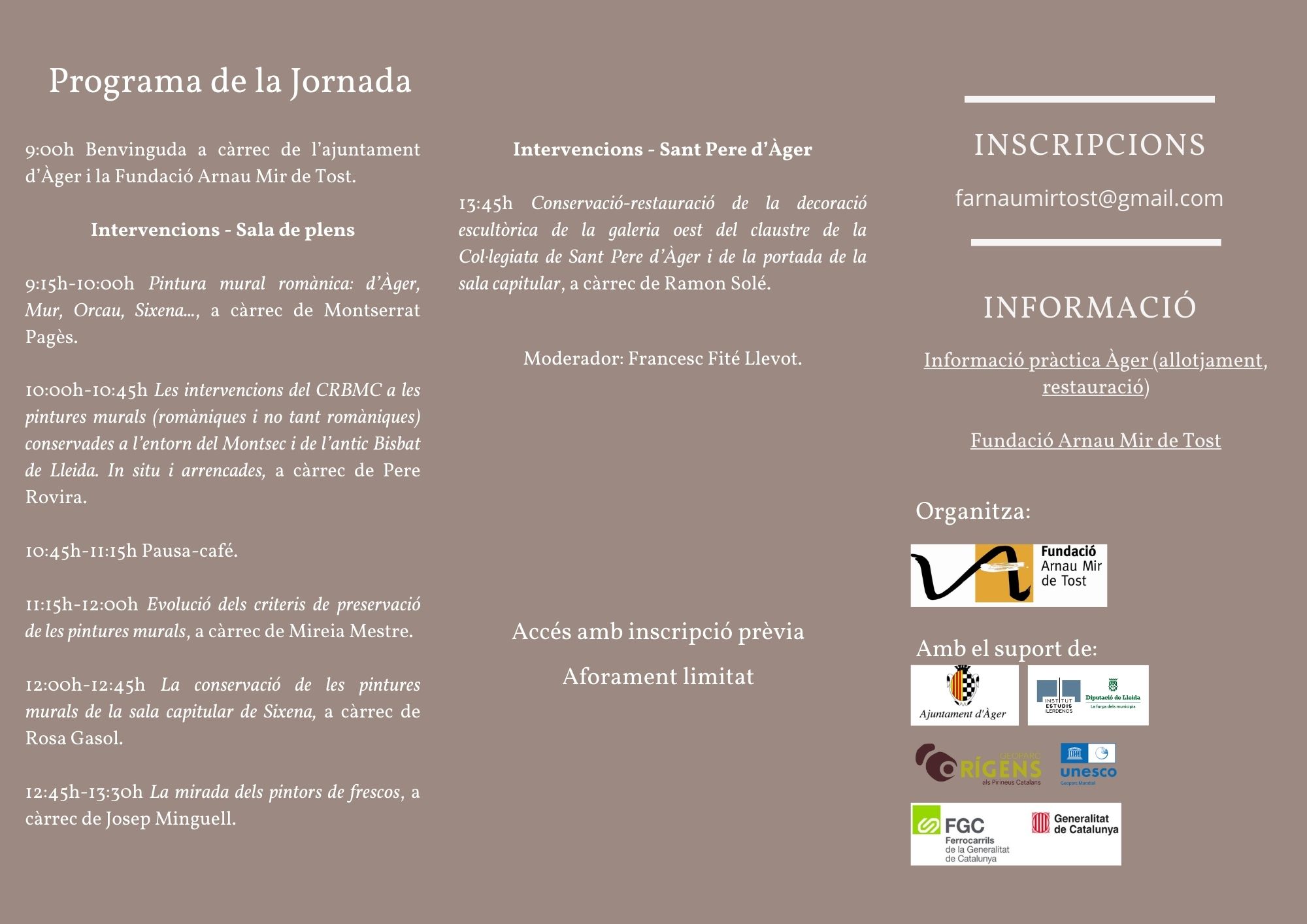La Jornada és gratuïta, però cal inscripció prèvia enviant un missatge al correu: farnaumirtost@gmail.com amb el nom complet. L’aforament és limitat.